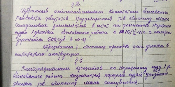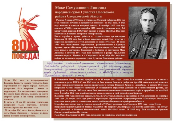 Липкинд Макс Самуилович - народный судья 1 участка Полевского района Свердловской области, гвардии капитан. Родился 5 января 1905 года в г.Борисове Минской губернии. В 12 лет стал учеником печника и проработал печником до 1927 года. В 1920 году окончил 6 классов вечерней школы. В октябре 1927 года был призван в РККА, служил до ноября 1929 года в 4 стрелковом полку 2-о1 Белорусской дивизии. В 1930 году принят в члены ВКП (б), в 1932 году окончил в Борисове вечернюю совпартшколу. После службы в армии работал в строительных организациях Борисова. В 1934 году был избран народным судьей 2-го участка Борисова, проработал в этой должности до июня 1941 года. 28 июня 1941 года был мобилизован Борисовским райвоенкоматом в Красную Армию, служил в Военных трибуналах Западного фронта. Летом 1941 года в оккупированном Борисове фашисты создали гетто, куда были перемещены все евреи города. Жителям резервации был запрещен выход за территорию без специальных пропусков. Все евреи были обязаны нашить на левую сторону груди и на спину специальные нашивки. В ночь с 19 на 20 октября территория резервации была окружена, начался массовый расстрел жителей гетто. 20 октября 1941 года были убиты отец, мать, жена и ребенок Макса Самуиловича Липкинда.