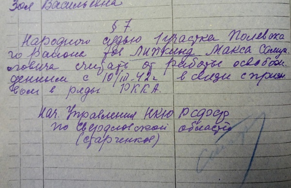 Записи в книге приказов Управления НКЮ по личному составу вид на Полевской с Думной горы. Фото https://sun9-55.userapi.com/impg/rZlNJgdw8c3DwTi0lsSf5bKnzoZpEYNWOsXpNg/ps5MmGK5OGU.jpg?size=1080x1080&quality=96&sign=6103b7418484ffe313f2e24b69612113&type=album В Полевском Макс Липкинд проработал до 10 марта 1942 года, затем был отозван с должности в связи с призывом в РККА. С мая 1942 года был членом Военного трибунала УралВО, затем после обучения на курсах усовершенствования военно-юридического состава Красной Армии в Ашхабаде в августе 1942 года направлен членом Военного трибунала 36 гвардейской стрелковой дивизии на Сталинградском фронте, где прослужил до ноября 1942 года, затем был назначен начальником дивизионного клуба и проработал до мая 1945 года. 9 декабря 1946 года демобилизован в запас, вернулся в свой родной Борисов. В декабре 1946 года он вновь был избран народным судьей 2-го участка Борисова и проработал в этой должности до сентября 1950 года. До марта 1953 года работал директором Борисовского торфопредприятия "Пастбище". Последнее известное место работы - начальник отдела снабжения Борисовского райпромкомбината. Награжден орденом Красной Звезды, медалями "За оборону Сталинграда", "За взятие Будапешта", "За победу над Германией 1941-1945 годов". В 1985 году был награжден орденом Отечественной войны II степени. Умер Макс Самуилович в 1987 году, похоронен на еврейском кладбище г.Борисова. Его имя увековечено на мемориале судьям и работникам аппарата судов - участникам Великой Отечественной войны и труженикам тыла, установленном во внутреннем дворе Свердловского областного суда.