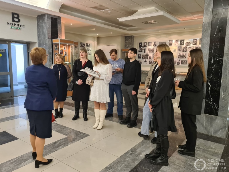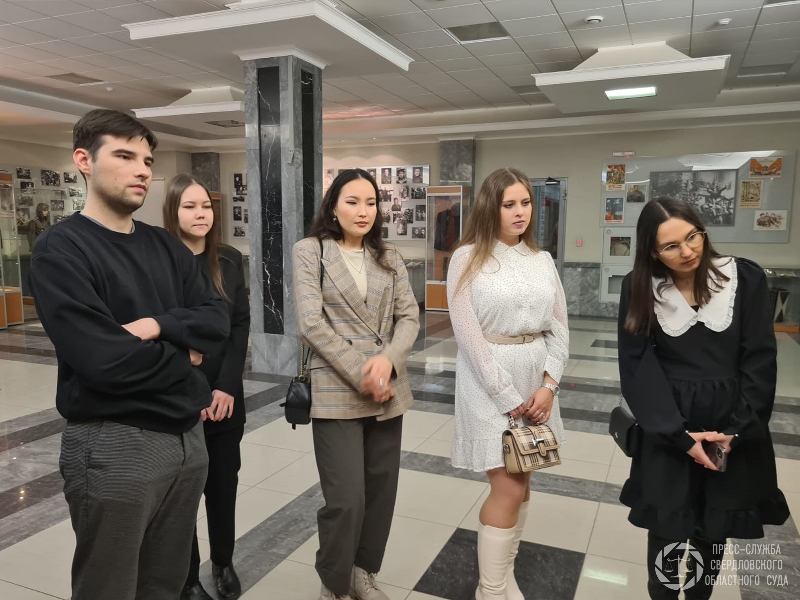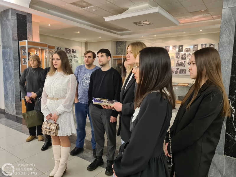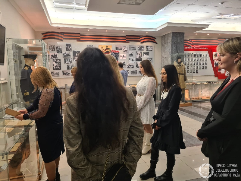 | В Свердловском областном суде прошла экскурсия для работников аппарата Арбитражного суда Уральского округа. Специалист пресс-службы Т.Н. Федотова рассказала гостям об истории областного суда. Особое внимание в преддверии юбилея Победы было уделено музейным экспозициям, посвященным Великой Отечественной войне. Они занимают холлы 2, 4 и 5 этажей и находятся в открытом доступе для всех посетителей суда. Здесь представлены фотографии судей-фронтовиков и тружеников тыла, работавших в суде в годы войны, их личные вещи и письма, а также другие многочисленные экспонаты, которые были собраны судьями и работниками аппарата. Сотрудники Арбитражного суда Уральского округа заинтересовались экспозициями, посвященными этапам истории Свердловского областного суда.