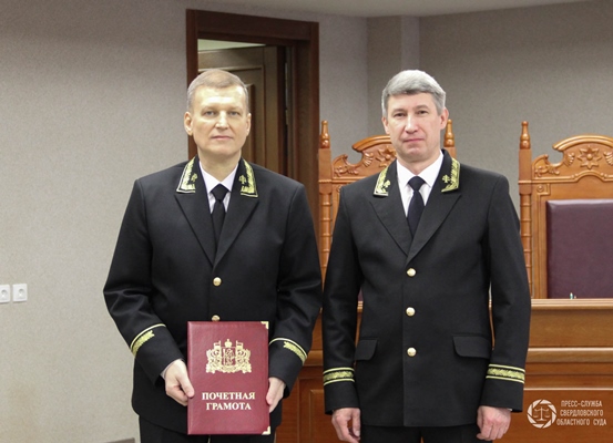 В Свердловском областном суде вручены награды. В торжественной обстановке председатель Свердловского областного суда Владимир Андреевич Дмитриев вручил Евгению Сергеевичу Шумкову, заместителю председателя по уголовным делам, медаль «За безупречную службу» Судебного Департамента при Верховном Суде Российской Федерации и Совета судей Российской Федерации. Награда присуждается за значительный личный вклад в развитие судебной системы, всестороннее содействие в укреплении и совершенствовании правосудия в Российской Федерации. Также за многолетний добросовестный труд, большой вклад в развитие судебной системы региона и в связи с 50-летием со дня рождения Евгений Сергеевич награжден Почетной грамотой Губернатора Свердловской области и наградным знаком. |