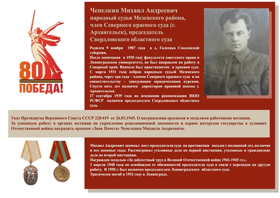 За успешную работу в органах юстиции по укреплению революционной законности и охране интересов государства в условиях Отечественной войны наградить орденом «Знак Почета» Чепелкина Михаила Андреевича. Михаил Андреевич занимал пост председателя суда на протяжении восьми с половиной лет, включая и все военные годы. Рассматривал уголовные дела по первой инстанции, уголовные и гражданские дела по второй инстанции. Награжден медалью «За доблестный труд в Великой Отечественной войне 1941-1945 гг». 2 апреля 1948 года он освобожден от обязанностей председателя суда в связи с переходом на другую работу. В 1950 г. был назначен председателем Ленинградского областного суда. Трагически погиб в 1952 году в Ленинграде. |