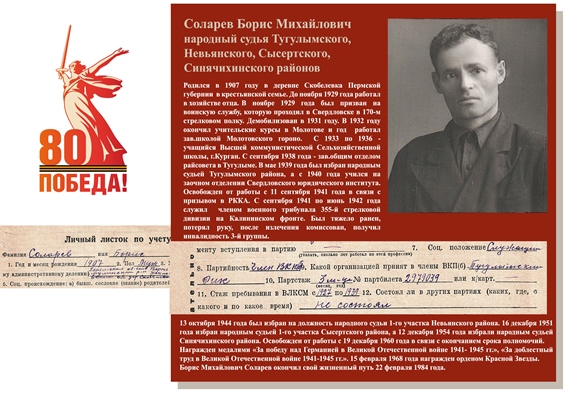 Соларев Борис Михайлович - народный судья Тугулымского, Невьянского, Сысертского, Синячихинского районов. Родился