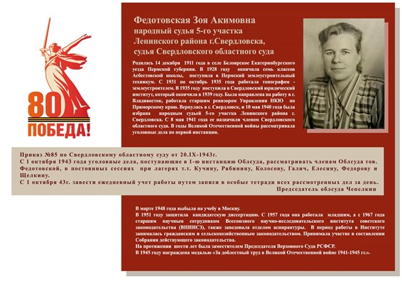 Федотовская Зоя Акимовна – народный судья 5-го участка Ленинского района г. Свердловска, судья Свердловского областного суда. ![]() Родилась 14 декабря 1911 года в селе Белоярское Екатеринбургского уезда Пермской губернии. В 1928 голу окончила семь классов Асбестовской школы, поступила в Пермский землеустроительный техникум. С 1931 по октябрь 1935 года работала топографом - землеустроителем. В 1935 году поступила в Свердловский юридический институт, который окончила в 1939 году. г. Владивосток. Источник: https://collectionerus.ru/collections/fareast-cards/913/ Была направлена на работу в г. Владивосток, работала старшим ревизором Управления НКЮ по Приморскому краю. Вернулась в г. Свердловск, и 10 мая 1940 года была избрана народным судьей 5-го участка Ленинского района г. Свердловска. С 8 мая 1941 года ее назначили членом Свердловского областного суда. В годы Великой Отечественной войны рассматривала уголовные дела по первой инстанции. В марте 1948 года выбыла на учебу в Москву. В 1951 году защитила кандидатскую диссертацию. С 1957 года она работала младшим, а с 1967 года старшим научным сотрудником Всесоюзного научно-исследовательского института советского законодательства (ВНИИСЗ), также заведовала отделом аспирантуры. В период работы в Институте занималась гражданским и сельскохозяйственным законодательством. Принимала участие в составлении Собрания действующего законодательства. На протяжении шести лет была заместителем Председателя Верховного Суда РСФСР. В 1945 году награждена медалью «За доблестный труд в Великой Отечественной войне 1941-1945гг.». |