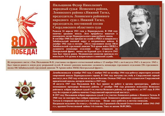 без отрыва от работы окончил Свердловский юридический институт. В 1957 году Пильщиков избран народным судьей 1-го участка Ленинского района г. Нижнего Тагила. В 1960 году он повторно был избран народным судьей Ленинского районного народного суда г. Нижнего Тагила и утвержден председателем этого суда. Позже ушел работать в систему спецсудов. Награжден медалями «За отвагу», «За победу над Германией в Великой Отечественной войне 1941-1945 гг.», орденом Отечественной войны 1-й степени. Ушел из жизни 30.09.2002 г. |