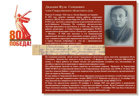 юстиции на Малышева, 2Б. В годы войны в Свердловской области было образовано несколько постоянных сессий Свердловского областного суда при исправительных лагерях НКВД СССР. Приказом по облсуду от 14 декабря 1942 года Дядькин был направлен на постоянную работу в Тавдинский лагерь НКВД СССР. В Тавду ему предлагалось выехать 20 декабря, а 1 января 1943 года приступить к разрешению организационных вопросов, связанных с открытием постоянной сессии. Фуля Семенович числился в Тавде несколько месяцев. Приказом по облсуду Дядькии Ф.С. 5 сентября 1943 года был отчислен из штата суда в связи со смертью, похоронен за счет средств областного суда. |